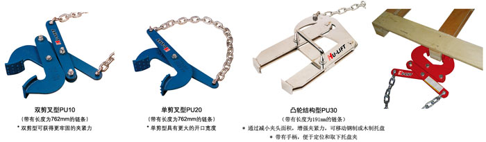 ● 適用于移動卡車、集裝箱或平臺上的托盤、板條箱等,以便叉車操作 ● 多種不同夾緊結構設計,可自動松開載荷.夾頭采用鋼性凸齒設計,能不受木屑、油脂或油漆等影響而自行保持干凈.使用方便 ● 帶有1/4寸防銹高強度鏈條