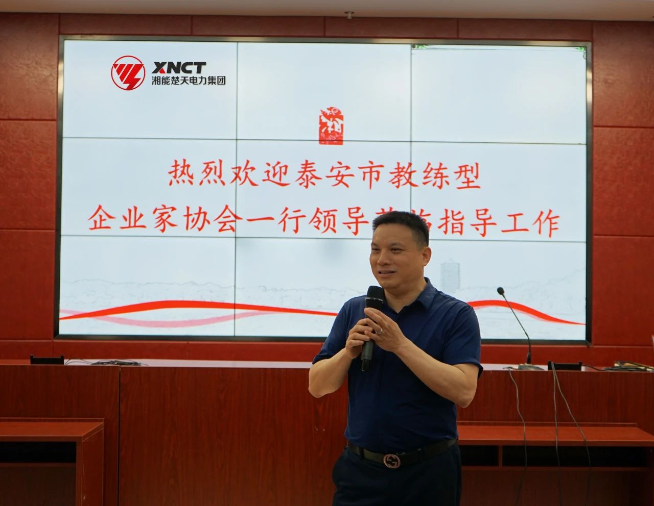 6月22日上午,由山東泰安巨鼎有限公司董事長、泰安市教練型企業(yè)家協(xié)會會長杜欣濤帶隊泰安市教練型企業(yè)家協(xié)會一行成員組49人蒞臨湘能楚天電力集團參觀指導工作,長沙市湘能楚天公益服務中心理事長、湘能楚天電力集團董事長陳偉其、行政后勤中心總監(jiān)劉正安等陪同。