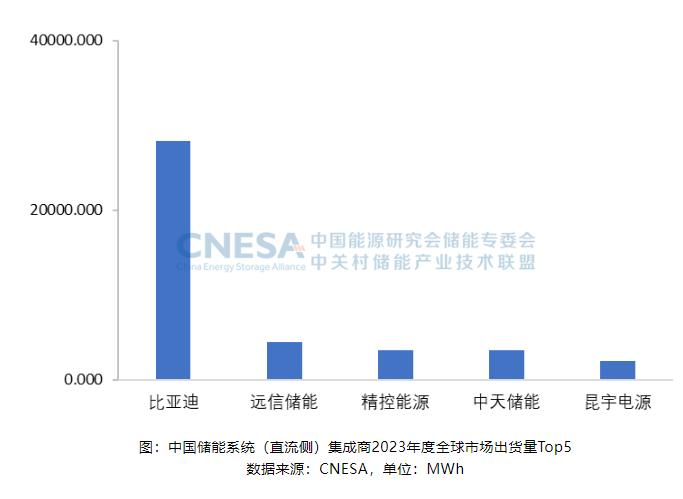 2023年,全球市場(chǎng)中,儲(chǔ)能系統(tǒng)(直流側(cè))出貨量排名前五位的中國(guó)企業(yè),依次為:比亞迪、遠(yuǎn)信儲(chǔ)能、精控能源、中天儲(chǔ)能和昆宇電源。