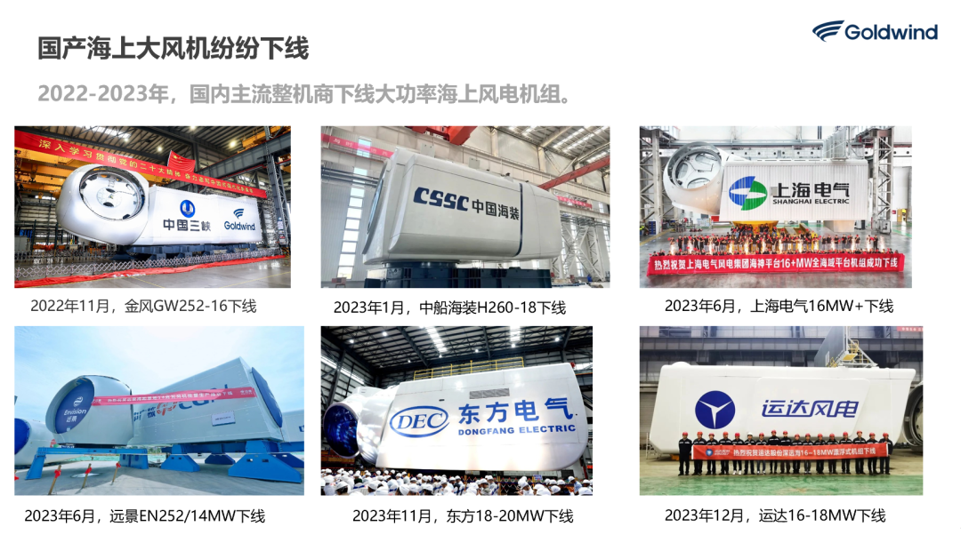 2021年海上風電機組主流已經在6MW到7MW水平,8MW到10MW機組已經投入了試驗運行。2022年海上風電機組主流到了8MW左右,10MW到11MW機組已經開始投入運行了。2023年的12-13MW機組達到批量應用, 2022年11月,金風16MW機組下線了,到2023年6月在福建平潭吊裝完成,同時2023年中國海裝的18MW機組已經下線,明陽的18MW機組也已經下線,10月份明陽的22MW的機組,還有20MW的風電機組都在持續下線。6月5日,由東方電氣自主研制的首臺18兆瓦半直驅大功率海上風電機組,在廣東省汕頭市風電臨海試驗基地成功完成吊裝,是當前全球已安裝的最大功率等級海上風電裝備,標志著全球已安裝的海上風電機組功率等級邁入新的里程碑。